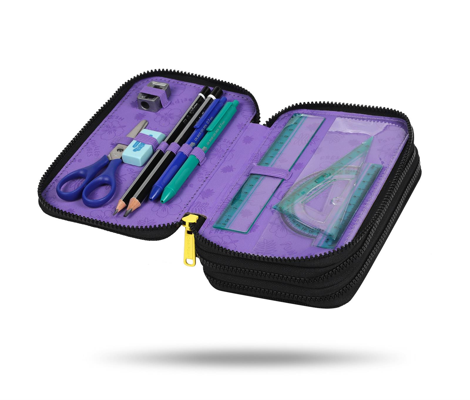 Das gefüllte Etui mit zwei Reißverschlüssen, perfekt für die Ordnung in der Schule und zu Hause. Alle wichtigen Werkzeuge ordentlich organisiert um der Kreativität keine Grenzen zu setzen.