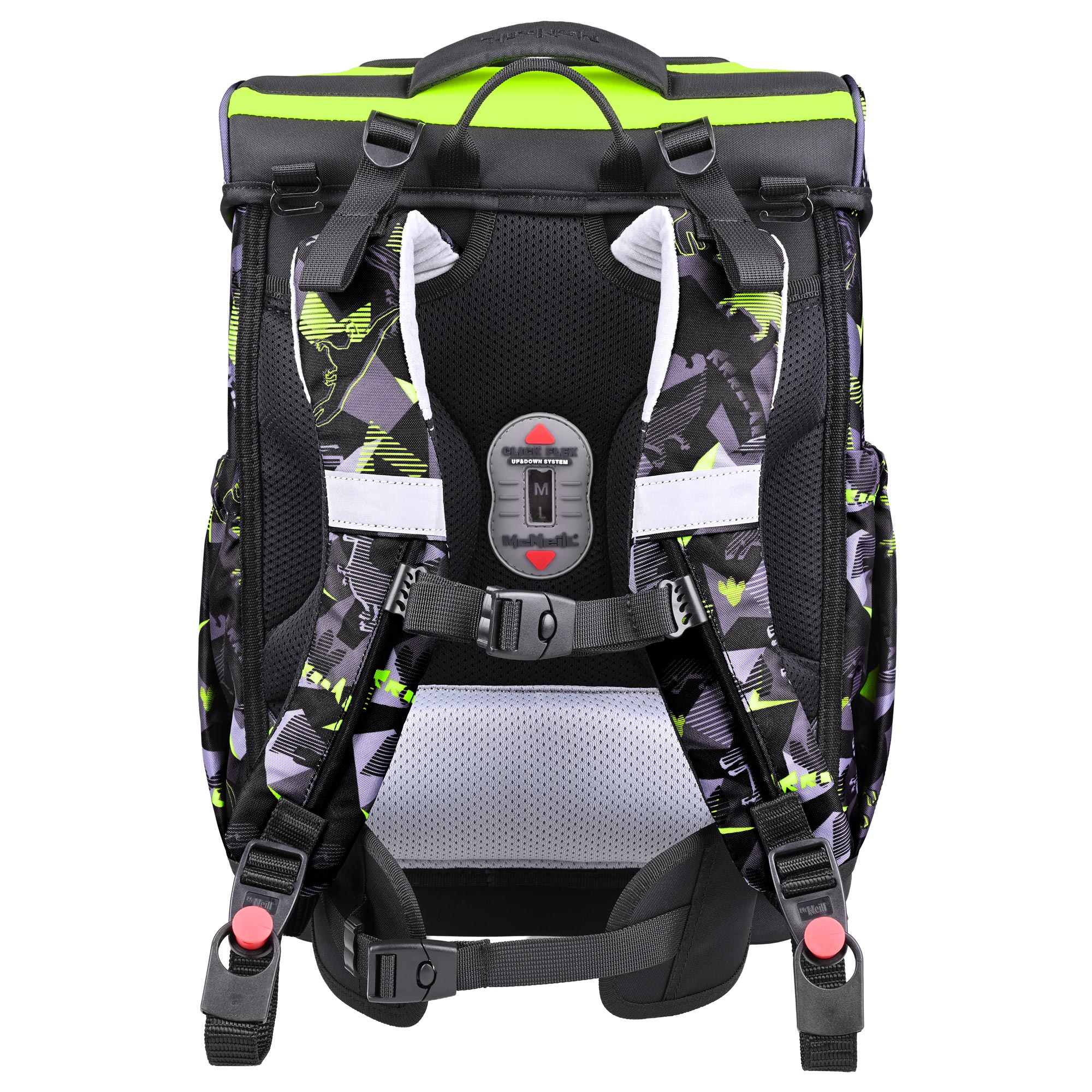 Der McNeill Bravo ist ein kompakter Schulranzen mit einem Fassungsvermögen von ca. 21 l (ca. 1.150 g) und einem höhenverstellbaren ClickFlex-Rückensystem. Er verfügt über einen abnehmbaren Beckengurt, ein praktisches Magnetschloss und diverse Reflektorflächen. Die softgepolsterten Trageriemen sorgen für ein angenehmes Tragegefühl. Der Bravo-Schulranzen ist ergonomisch geformt und zu 100 % PFC-frei. Mit den Maßen 30 x 40 x 22 cm ist er sehr gut für Kinder ab 120 cm geeignet. Er verfügt zudem über zwei Seitentaschen mit Gummizug und eine isolierte Vortasche. Zur Grundausstattung gehören ein gefülltes Schreibetui, ein Sportbeutel, eine Schlamperrolle, ein Schlüsselanhänger und ein McAddy. Zusätzlich gibt es eine Brotdose, eine Trinkflasche und einen weiteren McAddy gratis dazu.