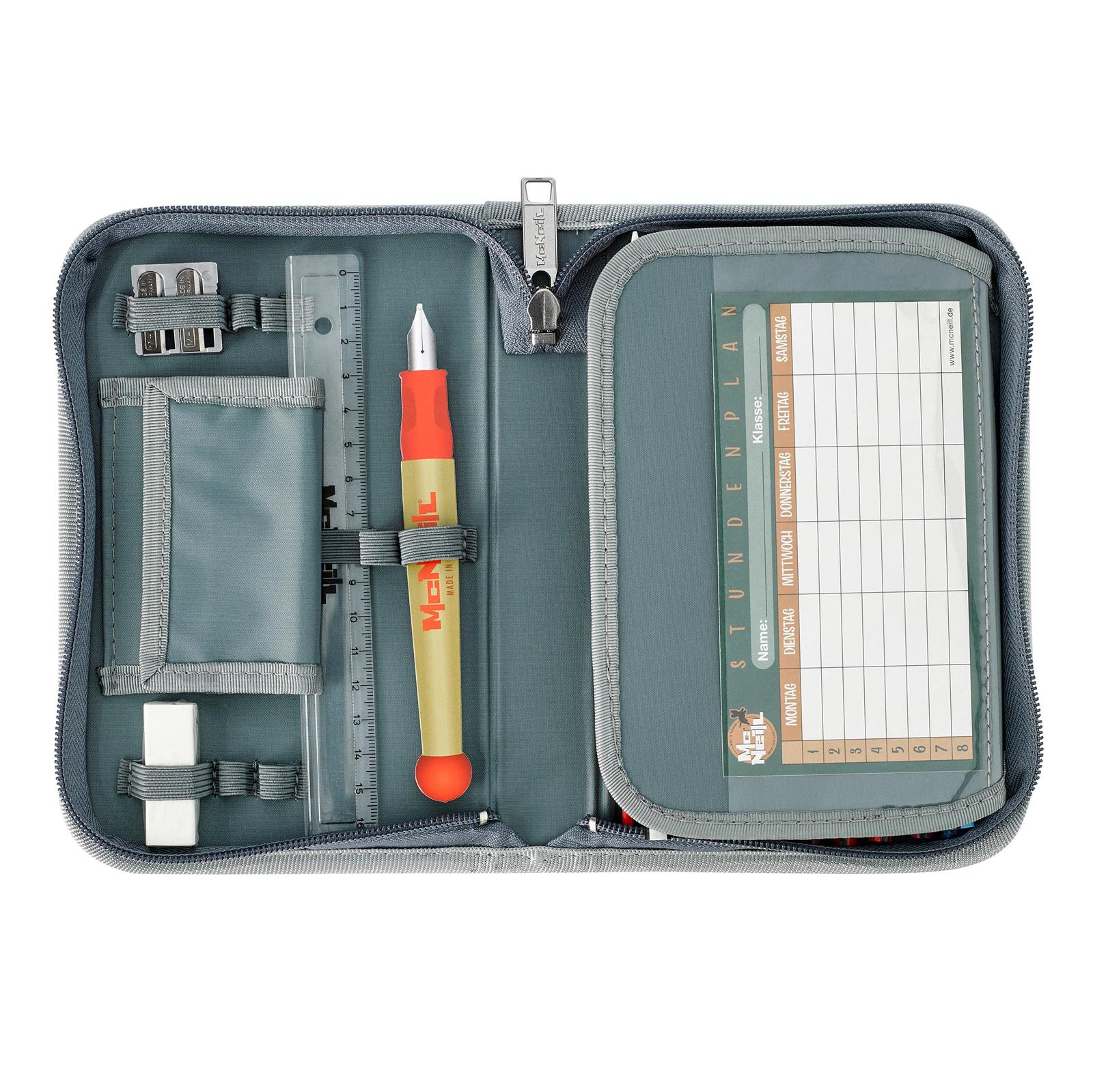 Das gefüllte McNeill Etui ist der perfekte Begleiter für die Schule. Das Etui ist mit vielen hochwertigen Stiften, einem Radiergummi und Anspitzer gefüllt. Das Etui lässt sich sicher verschließen und somit gut im Schulranzen transportieren.