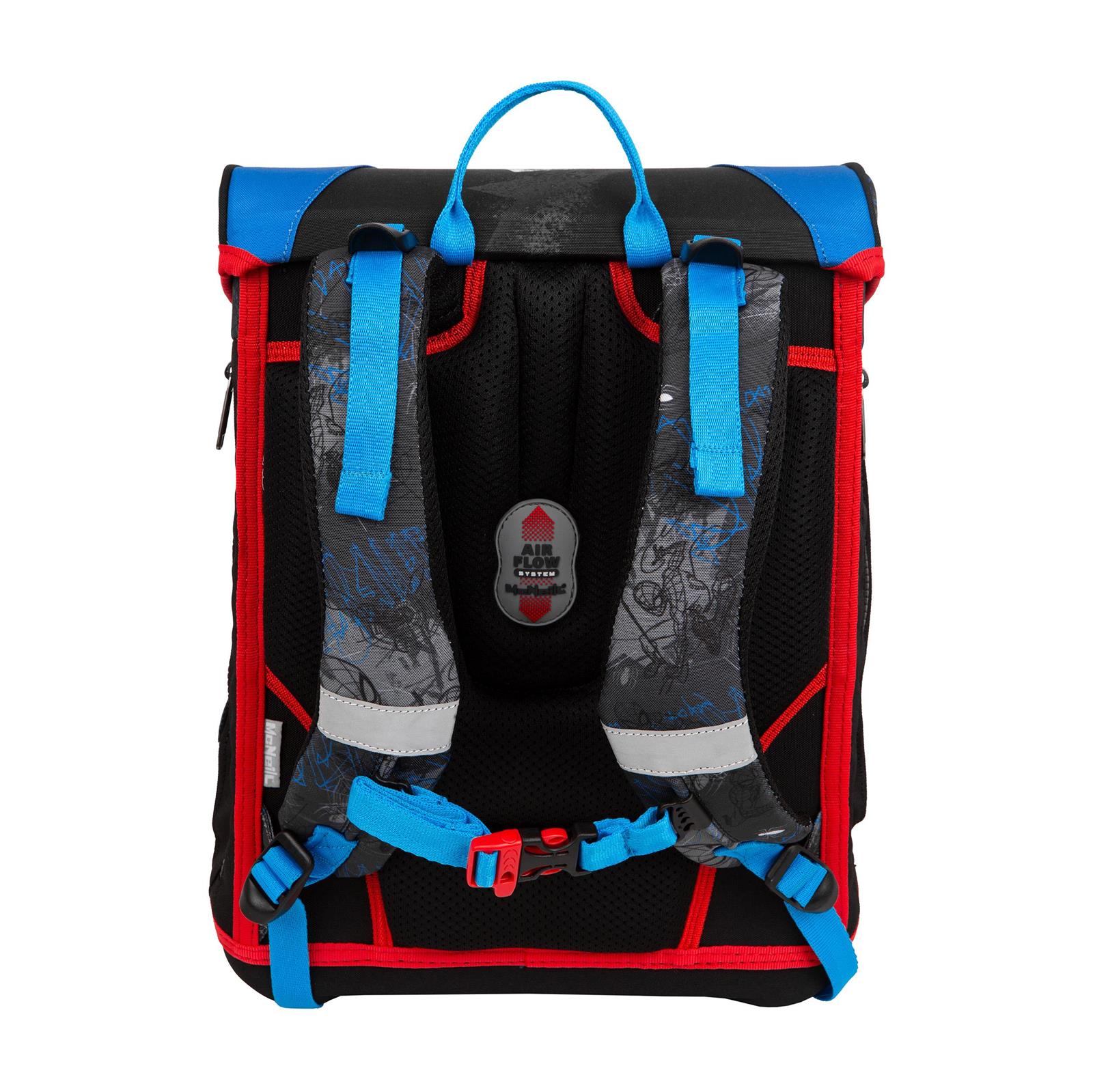 Das McNeill TENERIS Ranzen-Set mit gefülltem Etui, Schlamperrolle und Sportschuhbeutel. Mit atmungsaktiven Air-Flow Rückensystem und abnehmbaren Brustgurt. Die beiden Seitentaschen sind mit einem Reißverschluss versehen, Einhand-Magnetschloß. Im Inneren ein Strupp-Bücherfach.