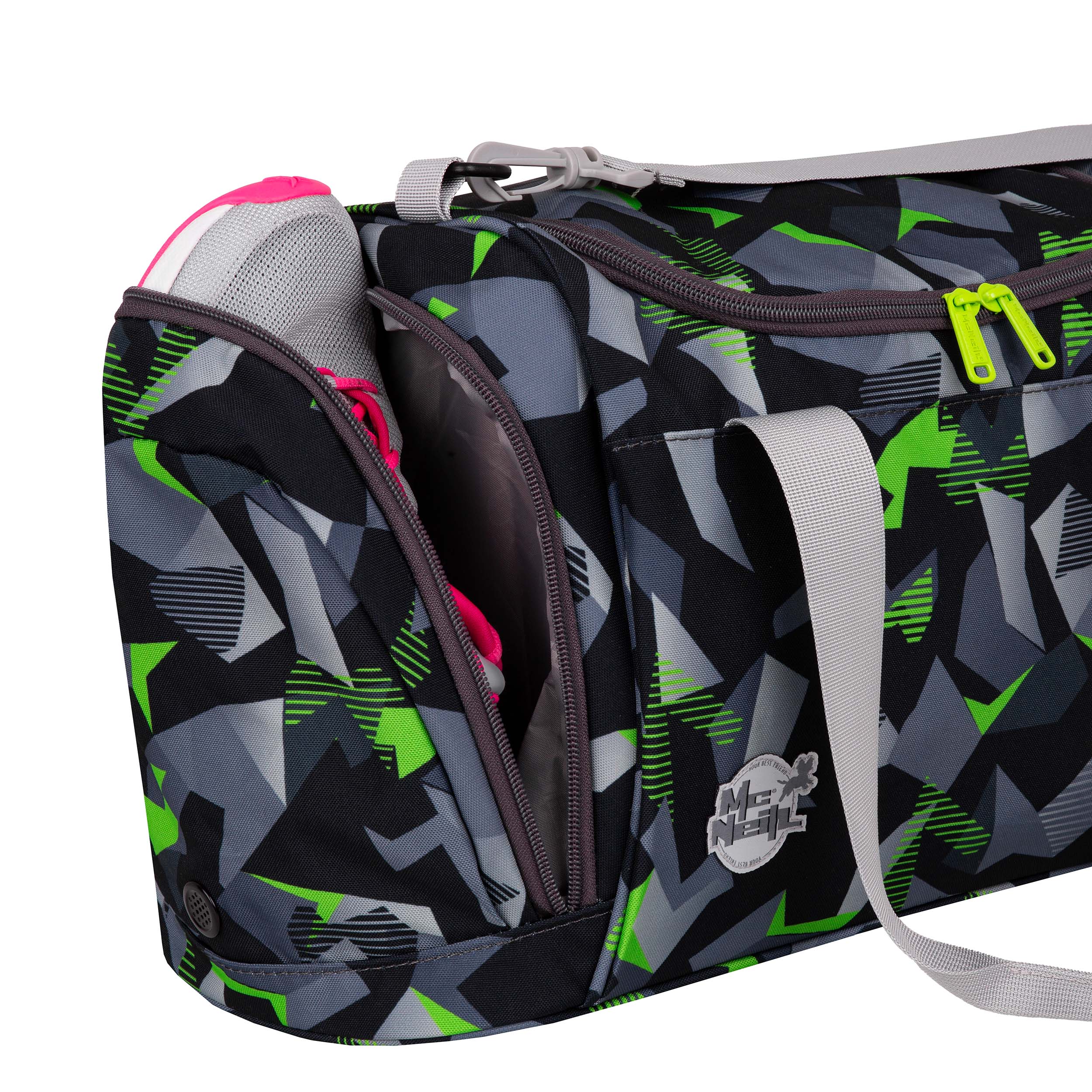 Die neue McNeill Sporttasche in der neuen abgerundeten Form ideal für den Sportunterricht und den Freizeitsport. Neben dem großen Hauptfach mit Reißverschluss verfügt die Tasche über ein großes Nassfach und ein weiteres Fach. Für ein angenehmes Tragegefühl sorgt der verstellbare Umhängegurt. Über die beiden Tragegurte kann die Tasche auf dem Rücken getragen werden, für zusätzliche Sichtbarkeit befindet sich auf der Unterseite des Bodens das große reflektierende McNeill Logo.